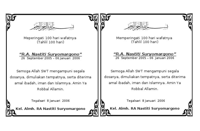 Itulah artikel yang dapat kami bagikan hari ini yang menjelaskan tentang download undangan tahlil 1 lembar isi 2 ms word bisa di edit untuk selanjutnya kami akan membuat undangan tahlil yang dapat download langsung dengan disertakan contoh undangan tahlil 40 hari orang meninggal word dengan begitu artikel ini akan semakin lengkap dengan. Cek 7+ kartu ucapan 100 hari orang meninggal. Contoh ucapan memperingati 1000 hari orang meninggal. Berikut ini undangan tahlilan 7 hari meninggal word. Contoh undangan tahlilan file microsoft word. Oh iya, cermati penggunaan kata amien di atas yhaa. Jika dirasa artikel ini bermanfaat silahkan bagikan. Selain itu gereja katolik memperingati hari arwah setelah hari tertentu orang meninggal yaitu hari ke 3 7 40 50 100 1 tahun 2 tahun hari ke. Halo teman, dipostingan ini kami akan membagikan informasi populer seputar ucapan 100 hari orang meninggal kotak nasi word. Peringatan 3 7 20 40 100 hari orang yang meninggal. Ada yang bilang arwahnya mash di sekitar rumah kita ada yang bilang tidak. Bersiap untuk ke mushola menunaikan sunah. Nah, lumayan rapih bukan, untuk mendapatkan file word dari desain kartu ucapan aqiqah di atas, anda dapat mendownload nya secara.